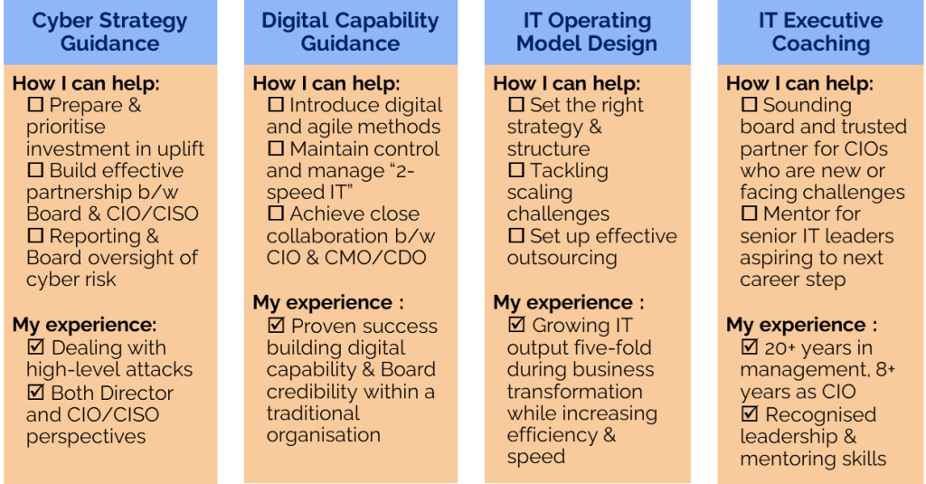 - When an incumbent CIO has too much on their plate and needs a trusted pair of hands to take on a specific challenge – I can speak the CIO’s language and be “in their corner”